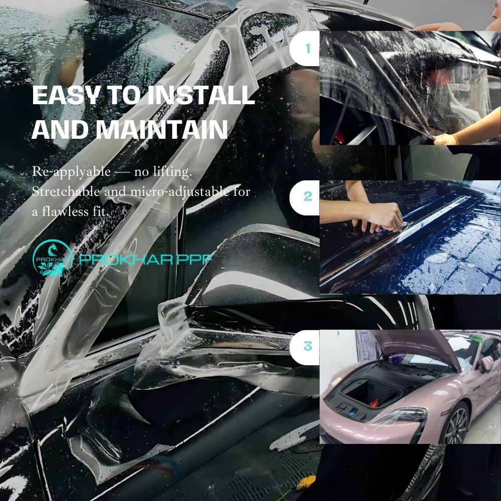 - Aliphatic TPU backbone — PROKHAR selects premium TPU as the structural core for superior elasticity, tensile strength and long-term optical clarity. This material choice reduces yellowing and helps the film retain a showroom finish for years.