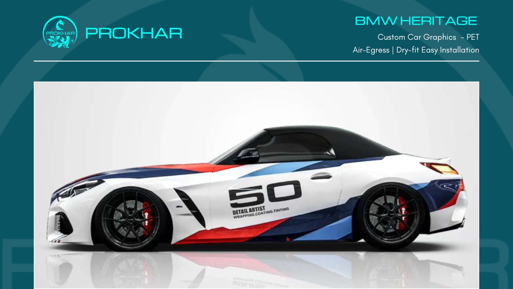 A model-matched wrap turns performance lines into a visual signature. For an overseas partner, PROKHAR produced a bespoke PET printed wrap for a BMW Z4 M40i using a classic BMW palette and vehicle-specific graphics—delivering precise color fidelity, flawless fit, and a standout street presence. Even if the car isn’t a Z4, our design team adapts the concept to any make or model while preserving the same premium aesthetic.