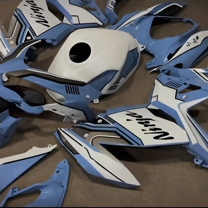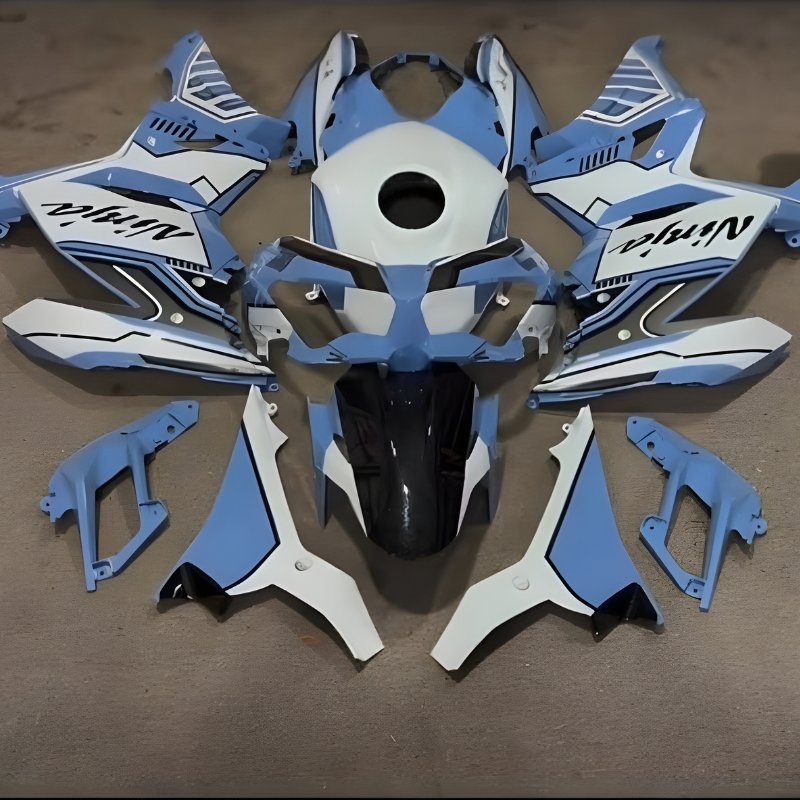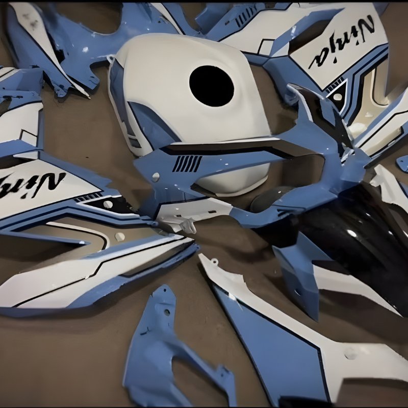Stop risking your expensive factory plastics. Our blue and white Custom Painted Motorcycle Fairings for the Ninja 400 deliver a zero-burr exact fit and a thick, multi-layer paint job that actually withstands the abuse of the track.